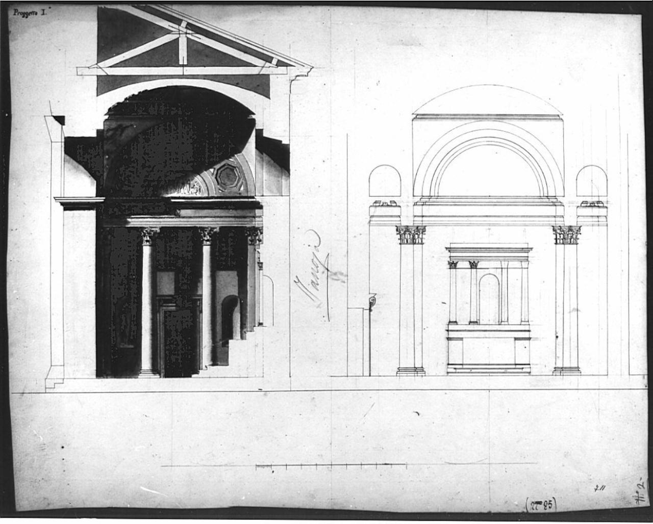 Progetto per cappella a chinat e bistro e matita con firma autografa di Zanoja al centro a matita. Sinistra: alzato lato della cappella con vista di due colonne libere e pilastri angolari con capitello corinzi, vista del fregio decorato e delle cornici. Superiormente: lunetta semicircolare con decorazioni, vista dei lacunosi dello cupola ribassata e delle capriate di copertura. Inferiormente: nicchie semicircolari con statua. Destra: studio per la parete ospitante l'altare (Ferrario).