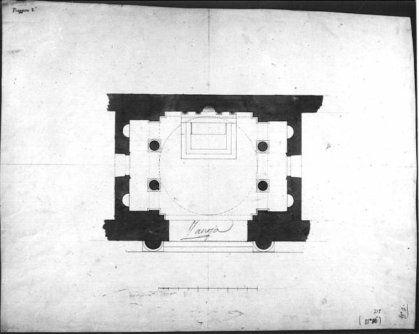 Progetto per cappella a chinat e bistro e matita con firma autografa di Zanoja al centro a matita. Pianta rettangolare preceduta da due gradini affiancati da due semicolonne circolari. Quattro colonne libere a destra, sinistra, con linea di tratteggio eludenti le volte d'unione tra le pareti inferiori e le superiori, latralmente segnalate due aperture fiancheggiate da due nicchie. Al centro superiore: altare rettangolare con mensa su base preceduta da due gradini. Sulla fronte sezione di quattro semicolonne.