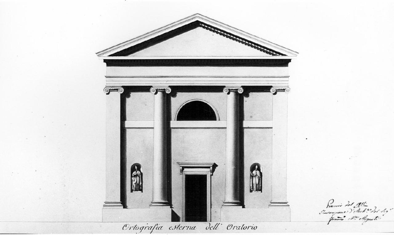 Prospetto di Oratorio a china e bistro su fondo chiaro entro linea di margine a china. Facciata racchiusa da paraste angolari lisce con capitello ionico, che con le semicolonne anch'esse ioniche, ai lati della porta d'ingresso sorreggono trabeazione con architrave a fasce e fregio liscio coronata con timpano liscio. Sopra la porta lunetta su fascia: frontone triangolare marcapiano liscio. Nelle specchiature laterali le nicchie con statue di papi. lnferiormente basamento su cui poggiano le colonne.