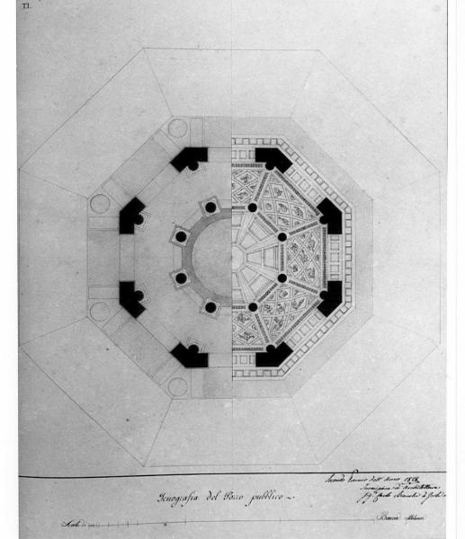 Progetto per pozzo pubblico a china, bistro e acquarello su carta leggera ocra con bordo acquarellato verde. Pianta ottagonale a due livelli di un pozzo. Sinistra: pozzo circolare con quattro colonne, deambulatorio, pilastri angolari con semicolonne negli angoli; vasche circolari corrispondenti. Destra: proiezione del soffitto con lacunari e decorazioni a rombi con soggetti marini per la copertura. Marginato.