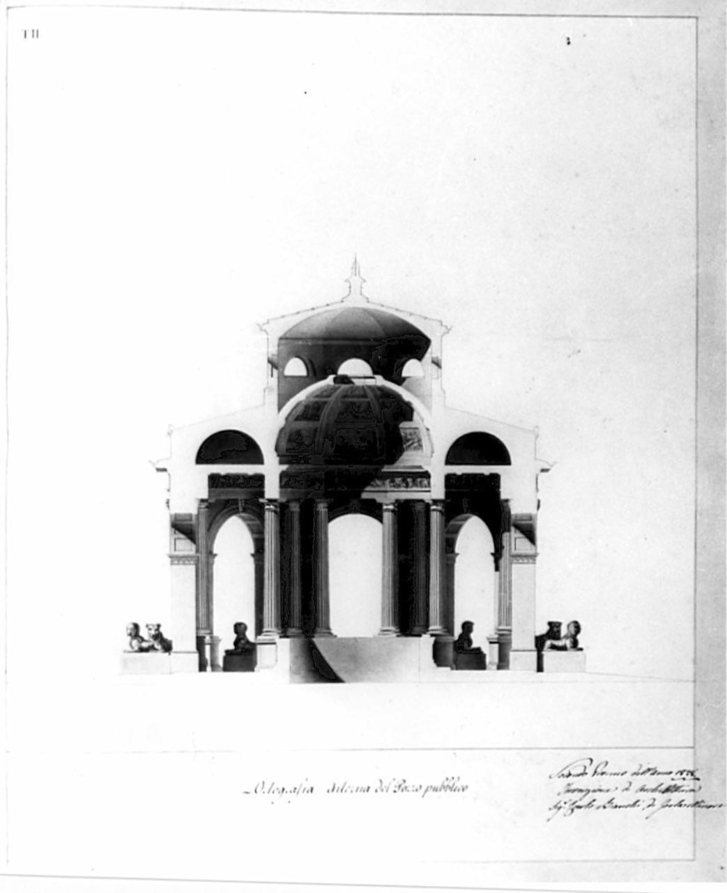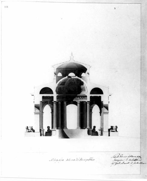 Sezione di un edificio a china, acquarello rosa, bistro, con ombreggiature più scure, entro marginatura ocra chiaro. Sezione del basamento, della vasca centrale e della copertura; centralmente sezione della cupola cassettonata con lacunari decorati con scene mitologiche del tiburio con aperture a lunette. Lateralmente sezione della copertura a lacunari con tetto a falda. Sul basamento figure leonine e colonne tuscaniche.Vista delle aperture ad arco con intradosso cassettonato. Trabeazione con cornice continua e decorazioni con divinità e scene mitologiche. Marginato.