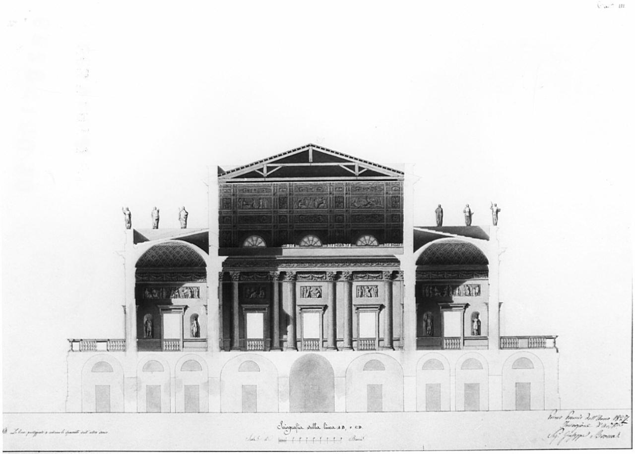 Marginato. Sezione di edificio a china, bistro e acquarello rosa e azzurro su sfondo chiaro, entro linea di margine a china. Vista dei corridoi e dei vani del piano terra con aperture ad arco. Superiormente centro: sala centrale con tre aperture balaustrate alternate da colonne binate corinzie con 3 cartelle scolpite superiori, fregio decorato e copertura a volta a botte cassettonata con 3 aperture a lunetta. Lateralmente: vani laterali con decorazioni classiche e aperture balaustrate e copertura a volta ribassata.