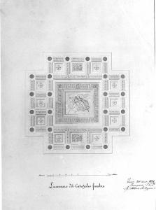 Marginato. Vista dal basso verso I'alto del soffitto del catafalco a china e bistro su fondo chiaro entro linea di margine a china. Soffitto costituito da dodici lacunari quadrati ai lati (formanti una croce greca) e centralmente un riquadro contenente un dipinto raffigurante l'angelo che conduce l'anima a Dio. Sono sezionate le ventiquattro colonne e si vedono i relativi capitelli.