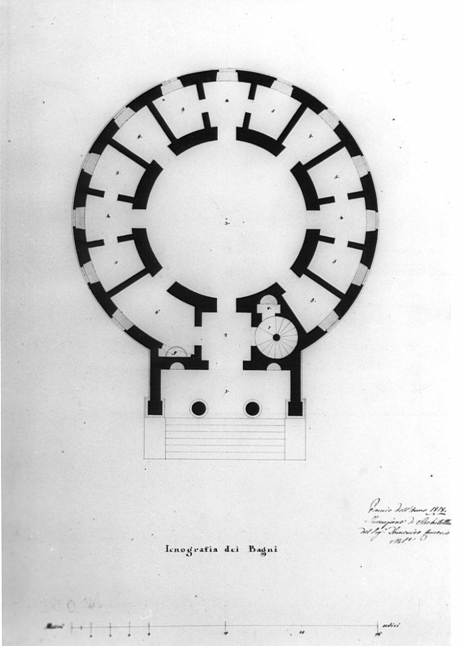 Pianta circolare a china e bistro su fondo chiaro entro linea di margine a china. Pianta ci rcolare preceduta da un pronao con gradinate. Sala centrale e serie di sale, con numeri di rif. ad una legenda non allegata, posti lungo il perimetro. Sezione sui fusti delle 2 colonne e sui pilastri del pronao. Scala a chiocciola a ds. dell'atrio d'ingresso. Marginato.
