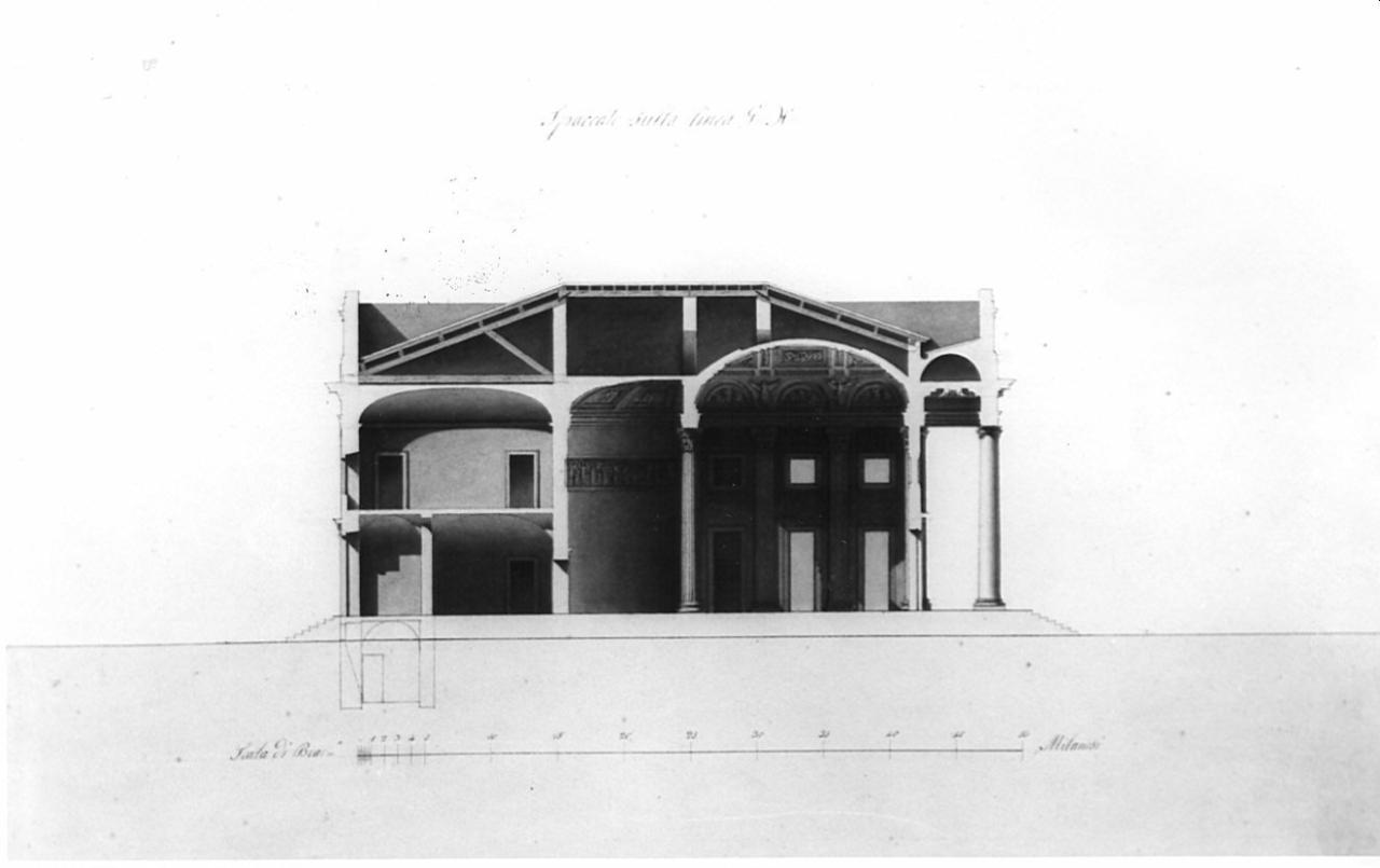 Marginato. Sezione di edificio a china, bistro e acquarello rosa, azzurro, ocra entro doppia linea di margine in china. Sezione della scala d'ingresso, del pronao con vista di una colonna liscia con cap. ionico e soffitto a cassettoni e fioroni. Sezione di un ambiente altezza con copertura a volta ribassata, con vista della parete di fondo con 2 paraste corinzi e 3 aperture rett. (inf.) e 3 quadrate\n(sup.). Vista di una colonna corinzia che precede un ambiente semicircolare con cop. a volta ribassato e sulla parete riquadro con scene mitologiche. Attraverso un'apertura si accede ad altri 2 ambienti sui quali è posto un altro locale con 2 aperture. Tetto a falde\ncon sezione delle capriate.