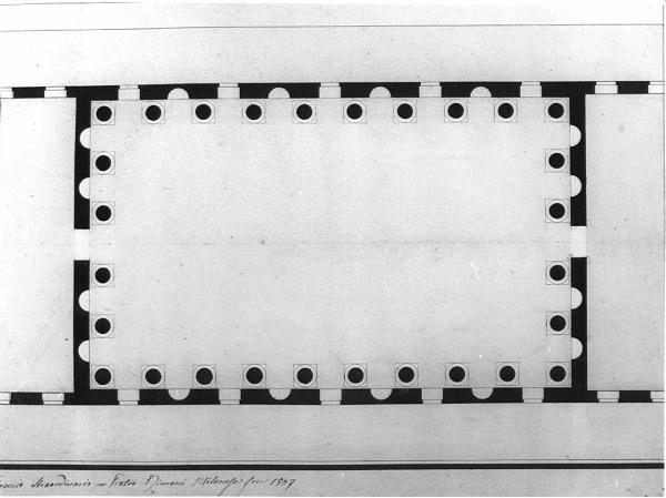 Marginato. Pianta di una sala rettangolare con campitura in acquarello rosato su fondo giallo chiaro murature sezionate campite in china nera. Sala a simmetria assiale verticale con ingressi posti al centro dei due lati minori. Serie di colonne libere sul perimetro interno, 6 alternate a nicchie sul lato minore e 5 finestre negli intercolumni; 10 alternate a nicchie sul lato maggiore.