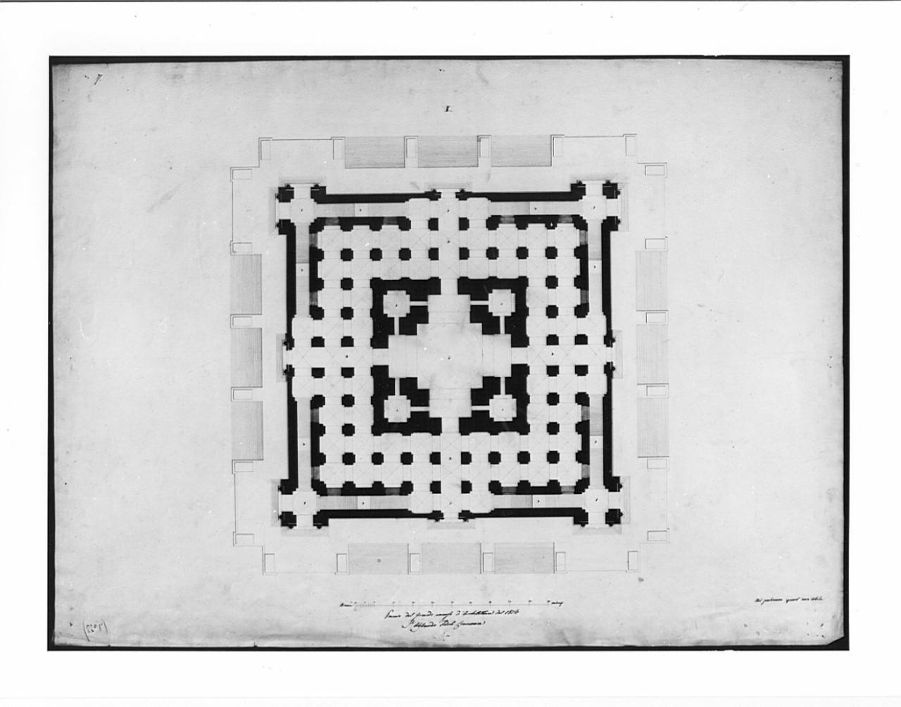 Disegno a china e bistro su carta vergata. Pianta di edificio quadrangolare a china e bistro su fondo chiaro. Pianta simmetrica con vano quadrato al centro con quattro vestiboli rettangolari comunicanti con i vani quadrati. Ampio spazio adiacente con pilastri cruciformi. Entro la muratura esterna scale d'accesso al piano sup.; 4 aperture centrali che accedono a basamentio esterno preceduto da tre gradinate per ciascun lato dell'edificio.