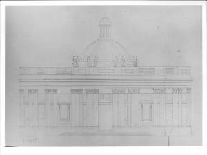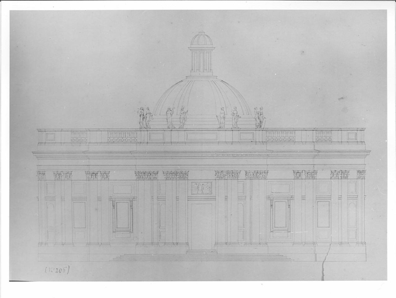 Disegno a china su carta vergata. Prospetto di edificio a china su fondo chiaro. Edificio concluso da terrazza con balaustra e cupola centrale. Sulla facciata lesene binate corinzie, aperture rettangolari con mensole e modanature. Ingresso principale con porticato aggettante con colonne binate corinzie. Una cornice marcapiano precede la terrazza con balaustrino e statue. Al centro cupola con lanterna.