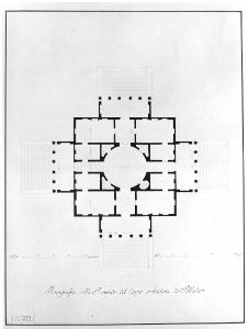 Disegno a china su carta vergata. Planimetria di edificio a pianta centrale a china su fondo azzurrato entro doppia linea di margine a china. Pianta con sala circolare con quattro vestiboli e serie di vani inscritti in un quadrato con quattro avancorpi porticati esastili preceduti da gradinate.