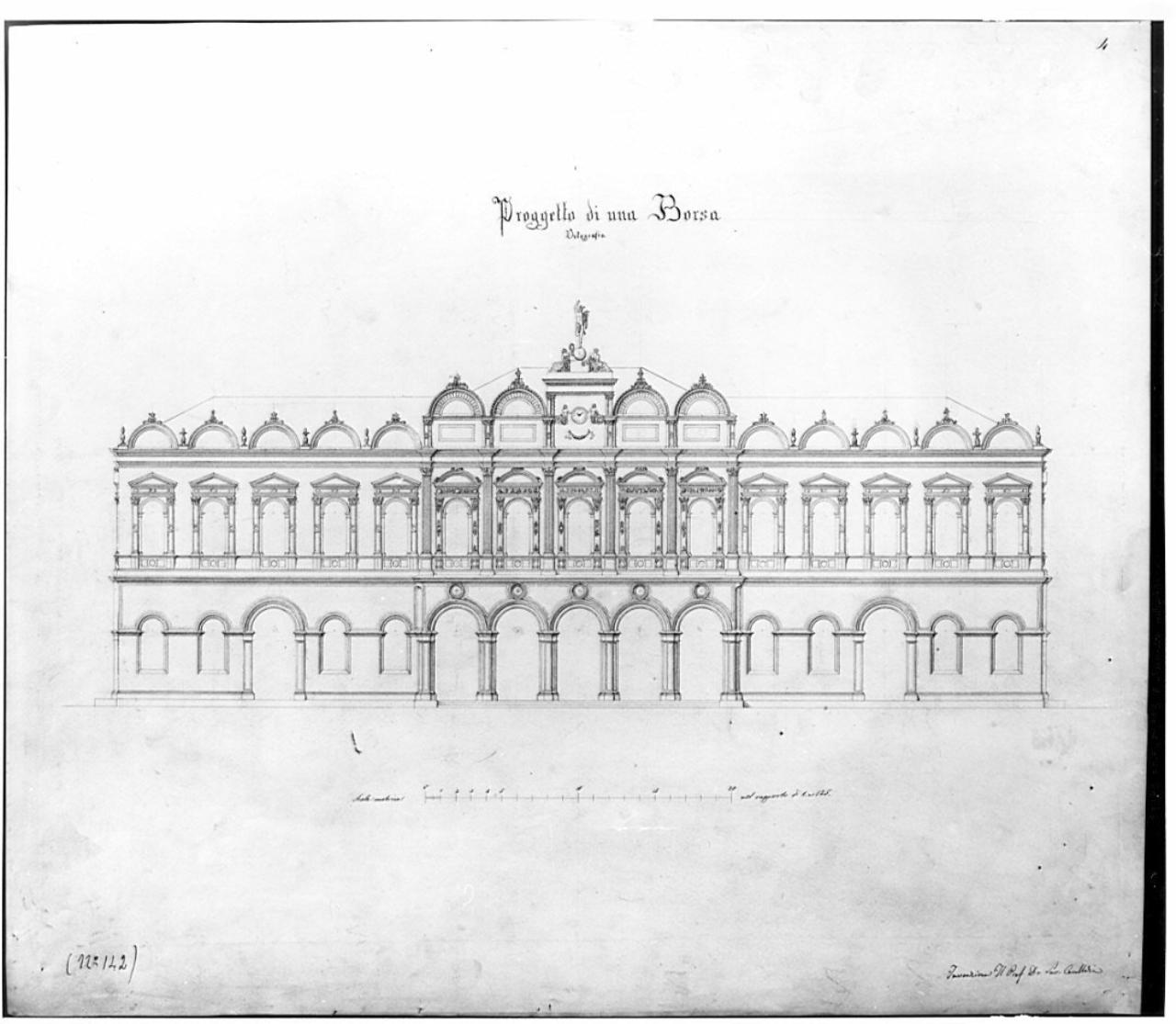 Progetto per Borsa a china su fondo chiaro. Prospetto di edificio a due piani con portico centrale inferiore, fiancheggiato da due aperture laterali e otto finestre quadrangolari. Il piano superiore presenta 15 finestre con balaustrino e modanature. Le cinque centrali hanno timpano curvo, le laterali triangolare. In alto: sul cornicione serie di archi intervallati da lanterne. Al centro, fiancheggiato da archi sopraelevati, orologio e statua di Marte.