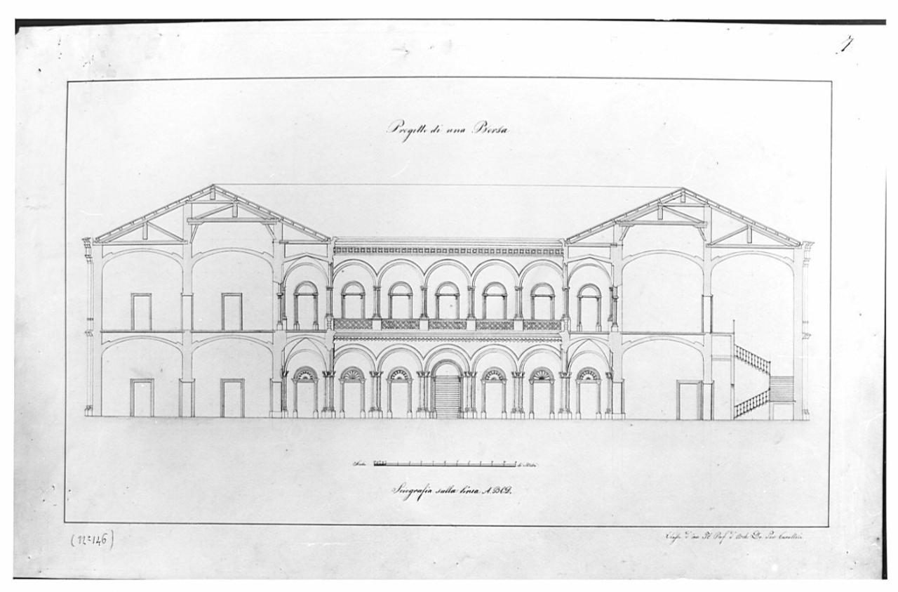 Progetto per Borsa a china, acquerello rosa, azzurro e marroncino su fondo chiaro entro linea di margine a china. Sezione sulla linea A.B.C.D. di edificio quadrangolare. A sinistra sezione di corpo di fabbrica a due pieni con coperture interne a volta ribassata e copertura a capriate. Al centro veduta del prospetto del cortile interno con aperture modanate. In alto: balaustra decorata a motivi geometrici e corrispondenti aperture ad arco. Cornicione terminale decorato. A destra: corpo di fabbrica con vista dello scalone a copertura a capriate.