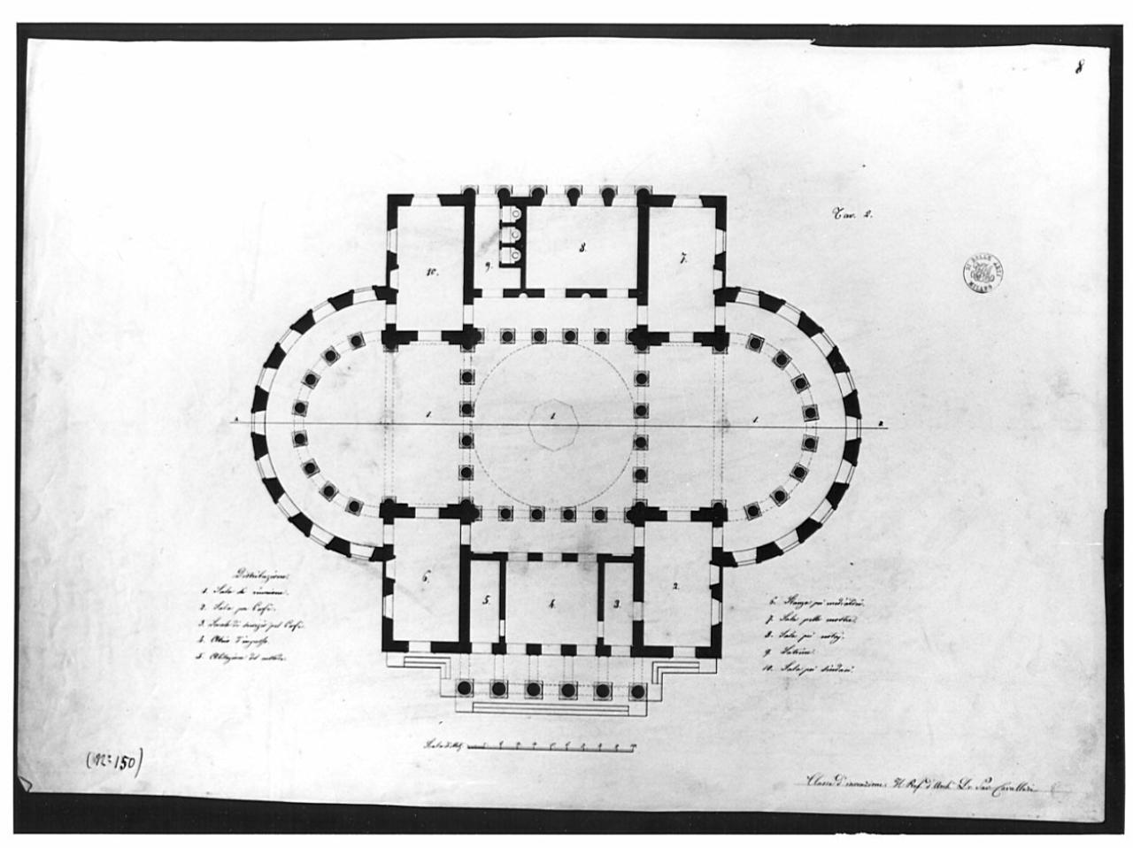Progetto per Borsa a china nera con linea di sezione a china rossa su fondo chiaro. Pianta di edificio quadrangolare con avancorpi laterali semicircolari con pronao esastilo sulla fronte. Sala centrale quadrata delimitata da colonnato aperta sugli spazi laterali. Anteriormente, serie di vani di servizo, anch'essi colonnati; posteriormente, sala per mostre, uffici notarili e latrine. In basso, a destra e a sinistra, legenda con numeri di riferimento.