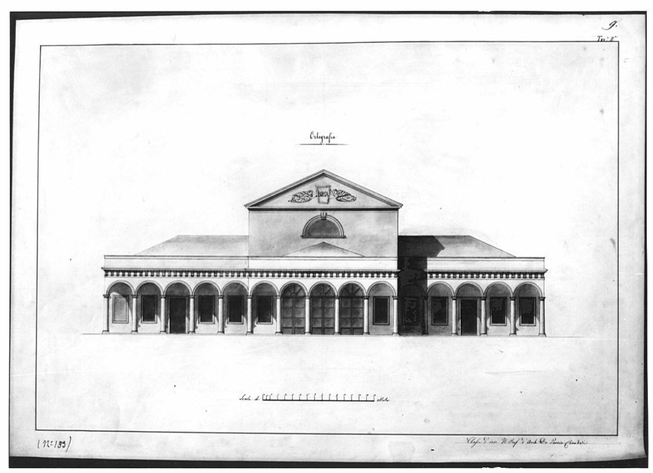 Progetto per Borsa a china, bistro e acquerello su fondo chiaro, entro linea di margine a china. Prospetto di edificio ad un piano con copertura a spioventi e avancorpo centrale timpanato. In basso: colonnato tuscanico con aperture quadrangolari. Segnalati al centro gli infissi delle tre porte; una cornice marcapiano a dentelli precede un fregio liscio. Al centro sup. apertura centrale a lunetta e timpano scolpito.