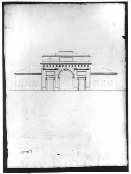 Alzato di porta urbana a china su fondo chiaro con tracce di matita. Prospetto con arco trionfale ad unico fornice centrale e due corpi di fabbrica con copertura a spiovente terminante al livello del fregio dell'arco. L'arco presenta sulla facciata quattro colonne su pidistallo lisce con capitello dorico e due aperture con modanature, architrave e mensole. Arco centrale con chiave di volta. Superiormente un fregio dorico precede un attico con tabula centrale.