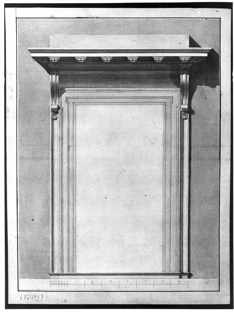 Alzato di finestra modanata a china e bistro su fondo bistrato entro doppia linea di margine a china e bordo chiaro. Porta rettangolare con cimasa e mensole. Sui piedritti serie di modanature a listello, astragalo e gole.