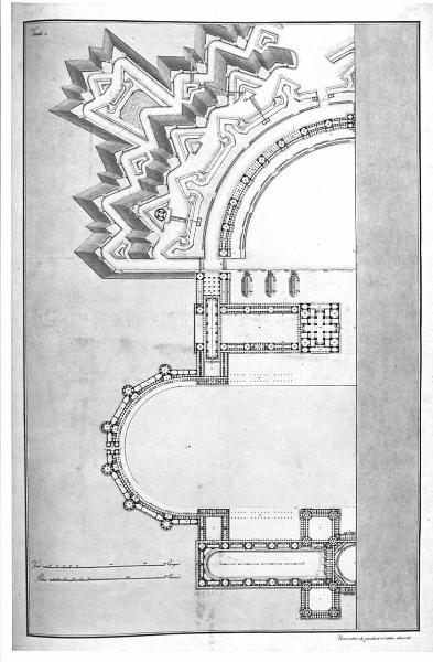 Un grande orfanotrofio militare. Oltre le abitazioni, gli uffizj, e tutto ciò che è necessario a un numeroso convitto, conterrà questo edifizio le scuole d'arti, e mestieri, che hanno relazione alla milizia, e varie grandi officine per manifatture.... architettura: orfanotrofio militare (pianta)