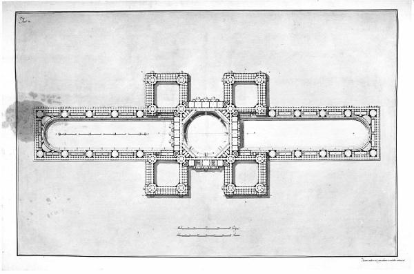 Un grande orfanotrofio militare. Oltre le abitazioni, gli uffizj, e tutto ciò che è necessario a un numeroso convitto, conterrà questo edifizio le scuole d'arti, e mestieri, che hanno relazione alla milizia, e varie grandi officine per manifatture.... architettura: orfanotrofio militare (pianta del corpo principale)