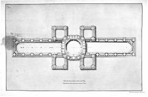 Pianta del corpo principale in china, bistro e acquerello azzurro. Corpo principale con corte ottagonale che distribuisce sugli angoli quattro edifici a corte quadrata. Ai lati due corpi che contengono rispettivamente: l'ippodromo, a sinistra, e la vasca per naumachie, a destra.