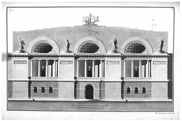 - NOTIZIE STORICO CRITICHE Il progetto appartiene ad una serie di 9 disegni redatti da Lorenzo Santi per il concorso di prima classe indetto dalla'Accademia di Belle Arti nel 1804 e da lui vinto (Atti dell'I.R. Accademia delle Belle Arti di Milano, Milano 1805, p. 37). Lorenzo Santi, nato a Siena nel 1783, studia a Roma e Venezia e qui diventa insegnante di disegno al Collegio della Marina. Il disegno è rilegato insieme ad altri progetti per i concorsi di prima classe di Brera, nella cartella MI 91.