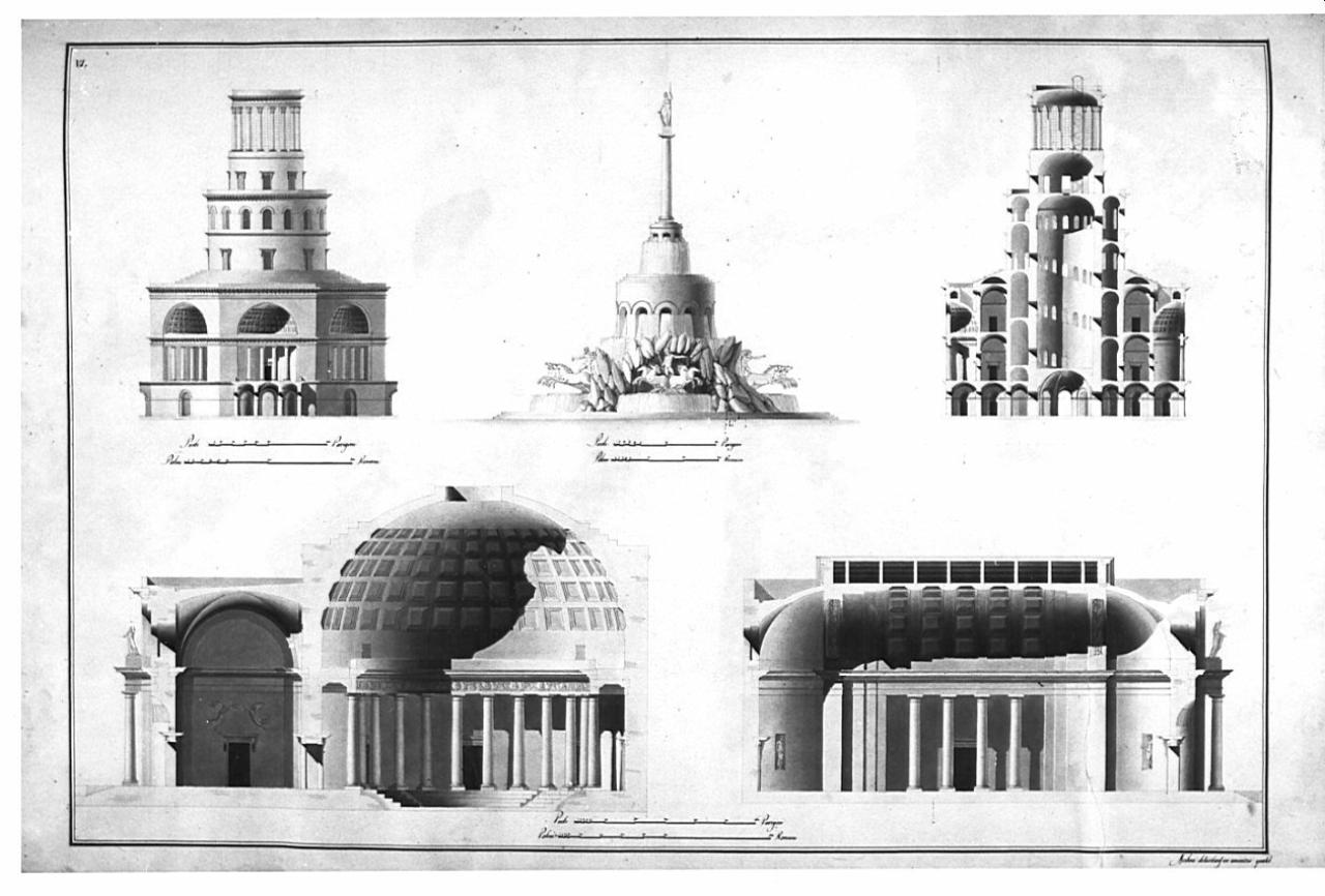 Un edifizio alla maniera degli antichi Musei Pitagorici Italiani, che conterrà quanto fa d'uopo alla istruzione delle Scienze, e delle Arti. Oltre i gabinetti scientifici, le biblioteche, le collezioni di statue, di quadri, di antichità, ed oltre.... architettura: Edificio alla maniera degli antichi Musei di Pitagorici Italiani (prospetti e sezioni)