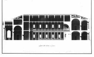 Sezione longitudinale mediana della basilica che ha l'ingresso principale verso l'esterno dell'edificio preceduto da un pronao tuscanico dorico. l'interno, a due ordini di colonne ioniche, si conclude con un'abside semicircolare e presenta un soffitto piano a cassettoni.