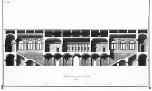 Sezione sullo scalone composto da due rampe opposte frontalmente. Al di sopra del vestibolo è collocato il salone del governatore, decorato con un partito di semicolonne ioniche e coperto da una volta a botte cassettonata.