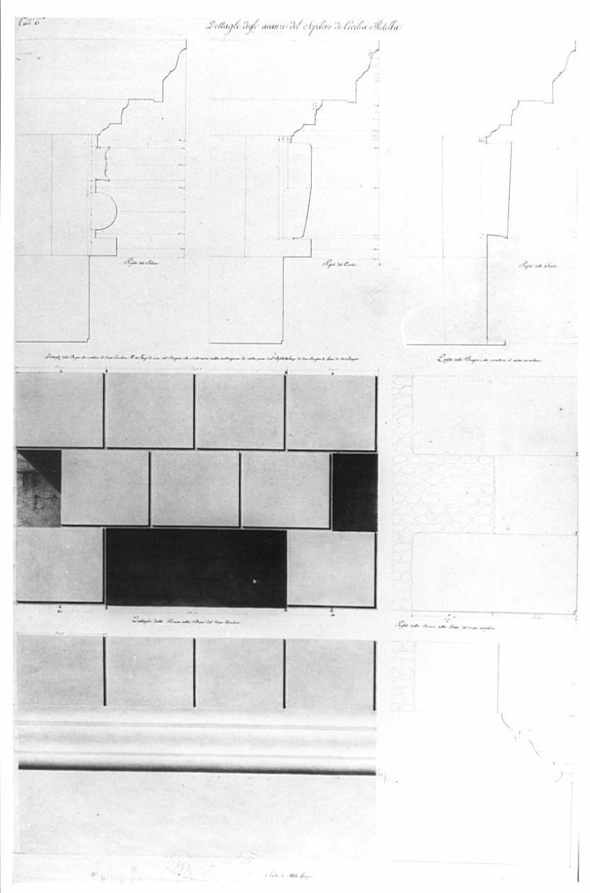 Serie di stte particolari sovrapposti del sepolcro di Cecilia Metella, a china, bistro e acquerello rosato su fondo chiaro, con quote a china rossa, entro linea di margine a china. Inf.: prospetto e profilo della cornice della base circolare. Centro: particolare e sezione del bugnato. Sup.: tre sezioni relative al festone, al teschio taurino e allo scudo scolpito del fregio.
