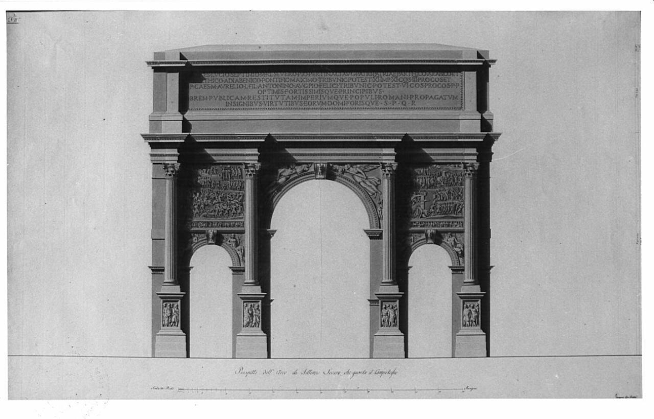Prospetto dell'Arco di Settimio Severo, a tre fornici, a china, bistro su fondo chiaro, entro linea di margine a china. I due archi laterali, terminanti all'altezza dell'imposta dell'arco centrale, sono sormontati da due bassorilievi rappresentanti scene di guerra. I pilastri portanti sono articolati da quattro colonne corinzie sostenute da quattro stilobati incisi. Sull'architrave liscia è posta una tabula con iscrizione incisa.