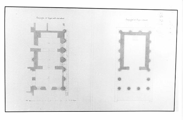 Serie di due piante del Tempio della Fortuna Virile, a china e bistro, su fondo chiaro, entro linea di margine a china. Sinistra: rilievo della pianta del tempio periptero, ridotto a chiesa consacrata, con veduta del pronao, della cella e dei resti esterni delle colonne ioniche, con gli intercolumni murati sul lato sinistro. Destra: pianta del tempio periptero restaurata.