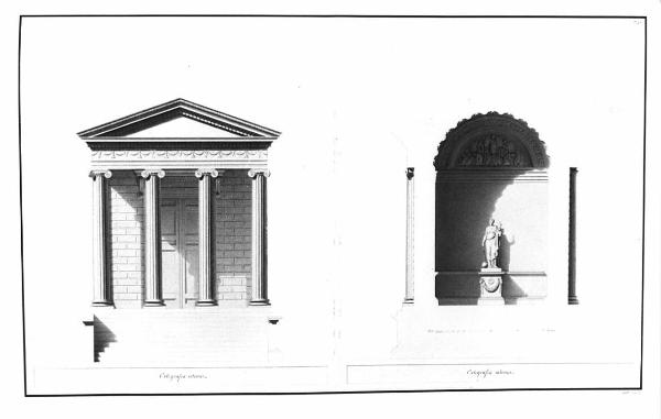 Prospetto e sezione del Tempio della Fortuna Virile restaurato, a china, bistro e acquerello rosa, grigio e beige su fondo chiaro, quotato, entro linea di margine a china. Sinistra: prospetto del tempio con veduta della gradinata d'accesso al pronao, delle quattro colonne frontali ioniche, delle pareti bugnate della cella e della porta d'accesso. L'architrave con fregio di festoni, putti e candelabri sorregge un timpano liscio con cornici incise. Destra: sezione sulla linea orizzontale con veduta dell'interno della cella; lateralm. profilo delle colonne esterne, al centro la statua dedicata alla dea.