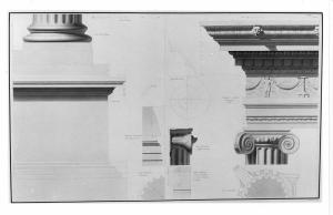Alzati, sezioni e piante della colonna e della trabeazione del Tempio della Fortuna Virile restaurato, a china, bistro e acquerello rosa e beige su fondo chiaro, quotato, entro linea di margine a china. Sinistra: prospetto del piedistallo e della base sorreggenti le due colonne laterali del pronao, sezione dell'architrave e di parte della colonna. Destra: pianta, profilo e fianco del capitello, alzato della trabeazione con spira della voluta e sezione.