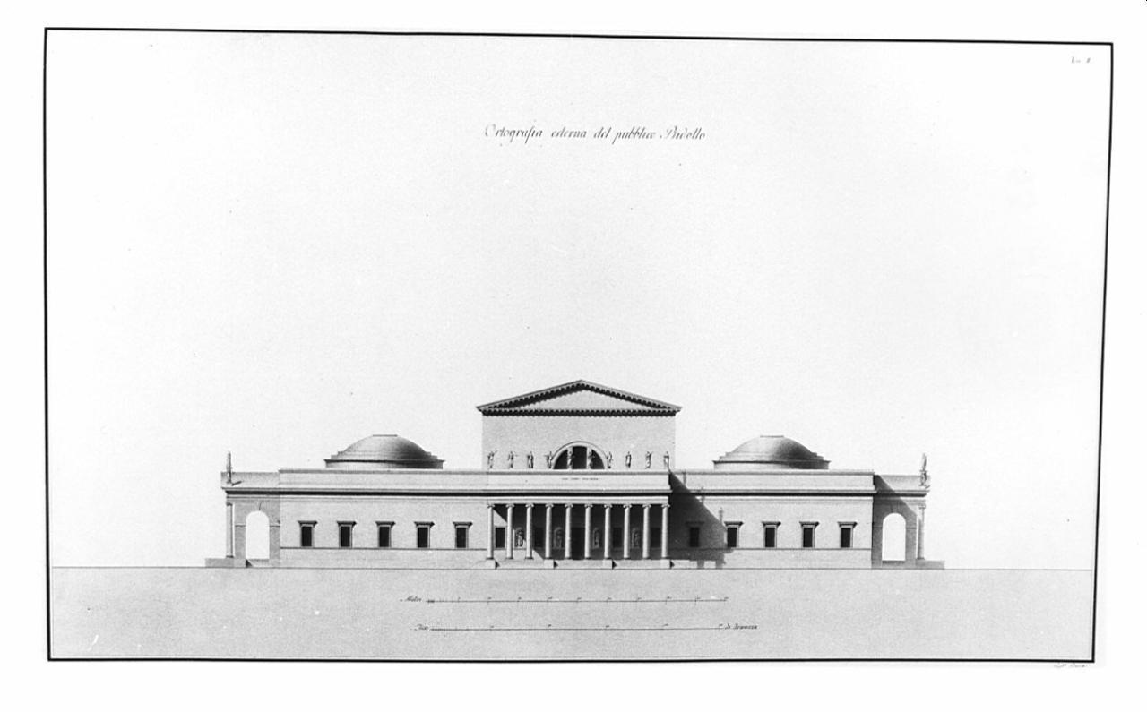 Alzato della facciata del Pubblico Ridotto, a china e acquerello grigio-beige su fondo chiaro, entro linea di margine a china. Prospetto, con l'ingresso principale formato da 10 colonne lisce con capitello ionico e precedute da gradinata. Sulle pareti dell'edificio 10 aperture architravate, lateralmente veduta dei profili degli ingressi laterali. Superiorm. un architrave liscio sorregge sull'ingresso: 10 statue, un timpano dentellato con un'apertura a semicerchio e, sugli angoli dell'edificio, due cupole schiacciate.