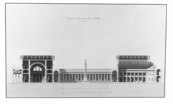 - NOTIZIE STORICO CRITICHE Il disegno appartiene ad una serie di 6 tavole redatte da Gaetano Besia nel 1812 come saggio del terzo anno di pensionato a Roma (Atti della R. Accademia di Milano, 1812, p. 58). Gaetano Besia aveva vinto il II premio per gli ordini architettonici nel concorso di seconda classe del 1808 (Atti..., 1808, p. 54). Ottenne la pensione triennale a Roma nel 1809. Ottenne la pensione triennale a Romanel 1809. Tornato a Milano nel 1813, fu assistente di Zanoja, professore a Treviso ed infine ancora a Milano dove, dal 1830, entrò a far parte delle commissione d'ornato sostituendo Giocondo Albertolli. Nel 1851 divenne direttore della scuola di architettura dell'Accademia di Milano. Il disegno è rilegato nel volume A I 189 contenente vari saggi di pensionato romano tra il 1810 e il 1817.