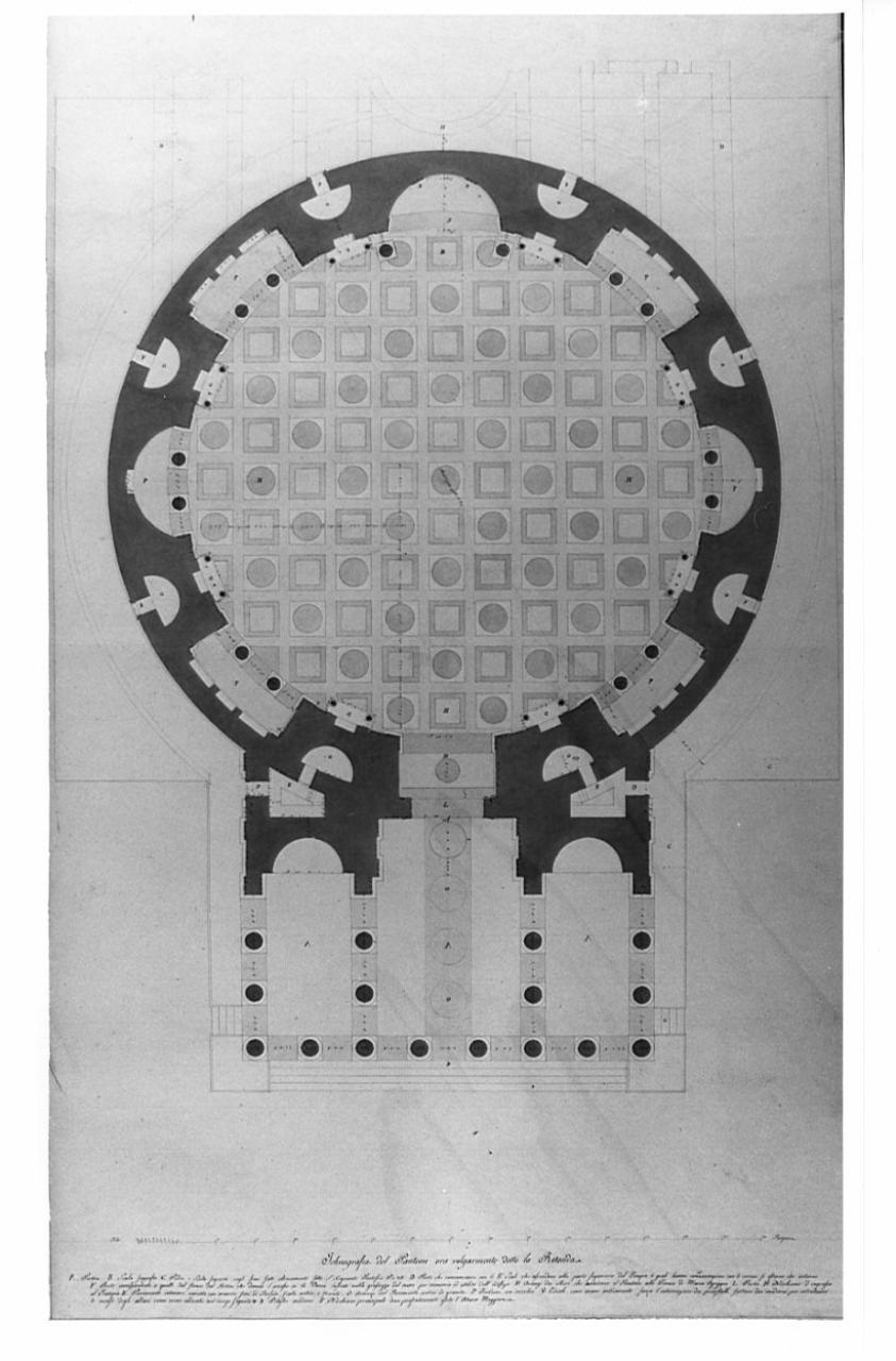 Pianta del Pantheon a china, bistro e acquerello giallo, viola e grigio, quotata, su fondo chiaro, entro linea di margine a china e bordo azzurro. Sezione orizzontale del tempio, preceduto dall'ampio portico colonnato, con veduta del vano circolare, del pavimento policromo interno e delle tribune con nicchie laterali. Rilievo esterno, tratteggiato, degli avanzi che univano il Pantheon alle Terme di Marco Agrippa. In basso, indice e lettere di riferimento.