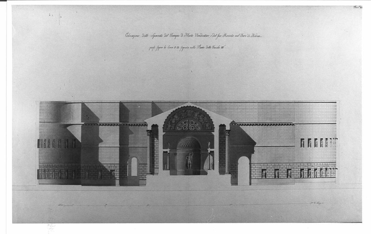 - NOTIZIE STORICO CRITICHE Il disegno appartiene ad una serie di 16 tavole redatte da Giacomo Bianconi probabilmente nel 1807 come saggio del terzo anno di pensionato a Roma. Nato a Milano egli studiò lettere, scienze pure e architettura, frequentò l'Accademia di Belle Arti di Brera vincendo due volte nei concorsi di I e II classe. Nel 1804 ottenne la borsa di studio, di quattro anni, per il soggiorno romano. Fu disegnatore presso lo stato maggiore militare del genio italiano e smise l'attività quando partì per Roma. Negli anni di pensionato inviò a Brera i saggi di fine anno e numerosi altri lavori elogiati dal Ministro degli Interni e dal Senato Accademico. Ciò gli consentì di ottenere un ulteriore assegno per compiere un giro scientifico in altre città italiane. Tornato a Milano divenne, nel 1810, professore di architettura all'Accademia Carrara di Bergamo. Negli anni successivi ottenne varie cariche onorifiche e operò in area lombarda (cfr. Francesco Ponzoni "Cenni biografici intorno al fu Giacomo Bianconi...", Milano 1858).