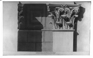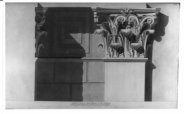 Alzato del capitello del Tempio di Marte Vendicatore nel Foro di Nerva a china, bistro e acquerello rosa su fondo acquerellato beige, entro linea di margine a china e bordo grigio-azzurro. Prospetto del capitello del pilastro corrispondente alle colonne del portico con la decorazione che esiste tra i capitelli e veduta del profilo delle bugne del portico.