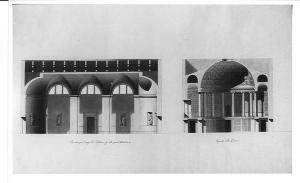 SpaccatI del Collegio di Educazione, a china, bistro e acquerello rosa su fondo chiaro, entro linea di margine a china e bordo grigio azzurro. Sezione longitudinale del refettorio con veduta dei pilastri, delle pareti lisce con nicchie e finestre termali. Spaccato della libreria con veduta del vano circolare colonnato e coperto dalla cupola.