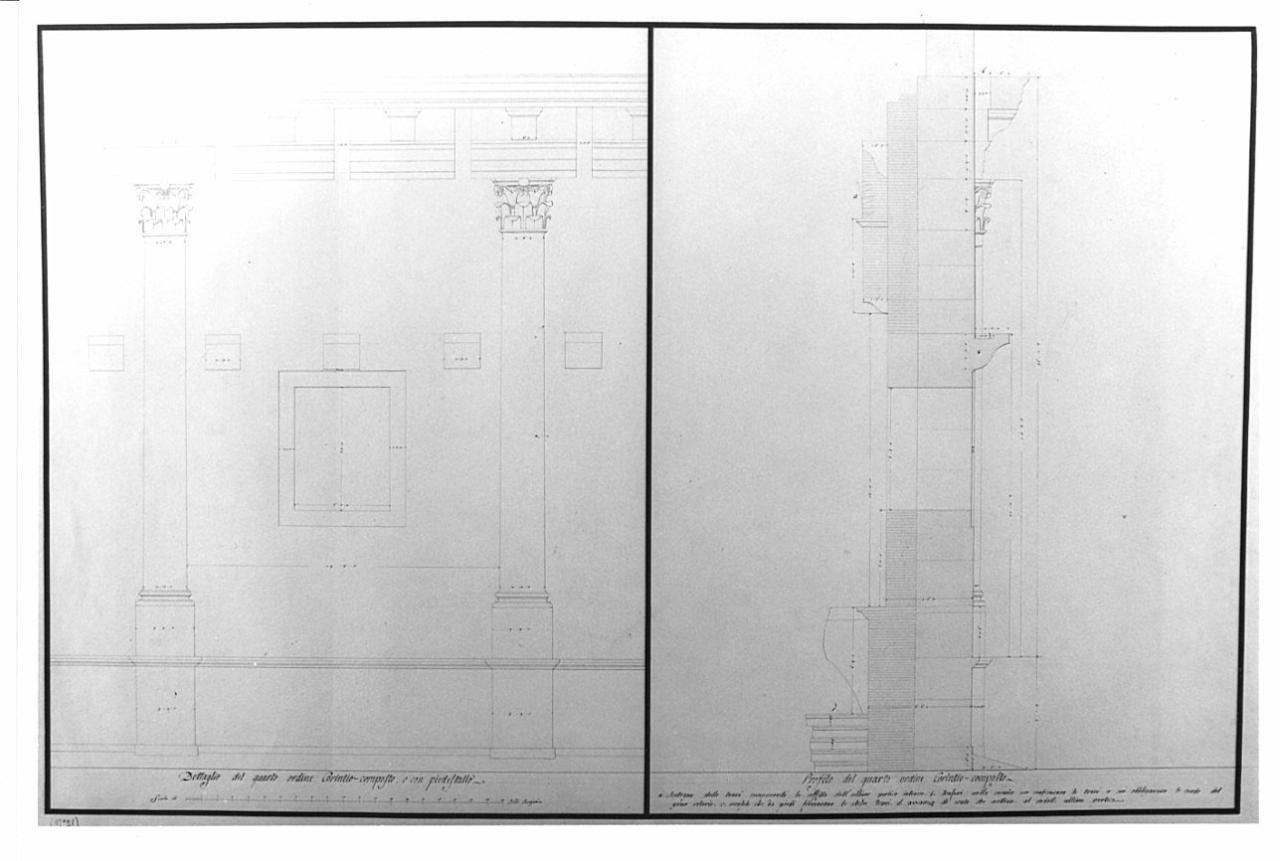 Particolari del quarto piano dell'Anfiteatro Flavio, entro margine. Sezione color rosato. Tavola divisa in dua parti: a destra, sezione sulla mensola e finestra con vista dell'ordine composito e la cornice terminale; a sinistra, prospetto della muartura esterna del quarto piano con paraste. Finestra rettangolare al centro con sup. mensole. Trabeazione a segmenti con cornice dentellata.