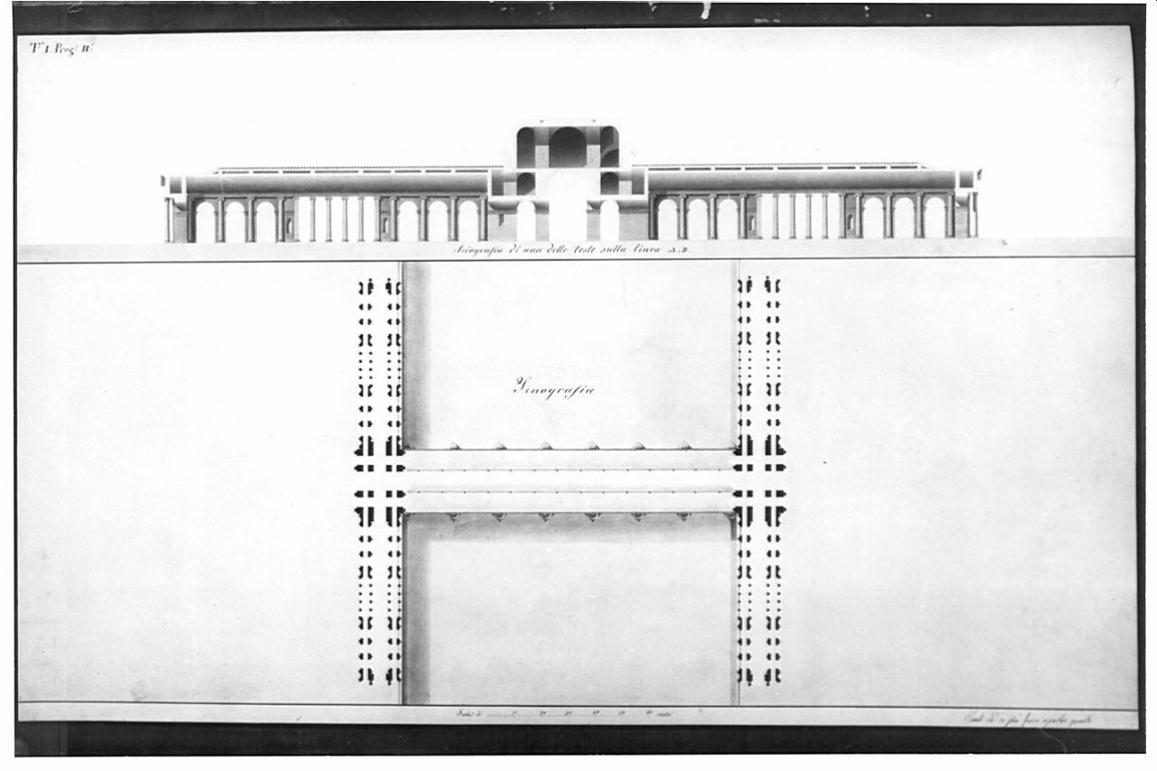 Progetto di Ponte Trionfale, entro margine grigio. lnf: planimetria formata da 3 passaggi paralleli su pile sopra il fiume, all'estremità corpo di ingresso a 3 gallerie parallele, quella centrale più ampia, simmetriche rispetto all'asse del ponte. Sup. sez. longitud. in mezzeria di uno dei 2 corpi d'ingresso. Parte centrale a 3 piani di arcate su pilastri e settori di muro. Ai lati, porticato formato da 2 arcate a 3 fornici con semicolonne ioniche separate da un setto murario con nicchia e pilastro ionico e da un colonnato con 4 colonne corinzie. La copertura della galleria è a botte.