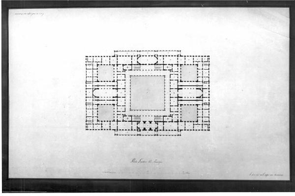 Progetto di un Municipio a china nera, rossa e bistro. Pianta simmetrica di edificio rettangolare con grande cortile centrale e 4 cortili minori e doppi ingressi; con pronao, atrio, vani scala e due grandi aule absidate. Numeri di riferimento a legenda a china nera. Bordo di margine del foglio marrone acquarellato.