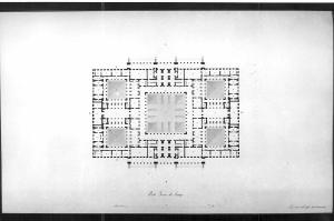 Progetto di un Municipio a china nera e rossa, bistro e acquerello grigio e azzurro. Vista dal piano terreno che presenta campiture in acquerello grigio, lo schema della pavimentazione dei cortili con accenni alle leggere inclinazioni che consentono lo scolo dell'acqua piovana.