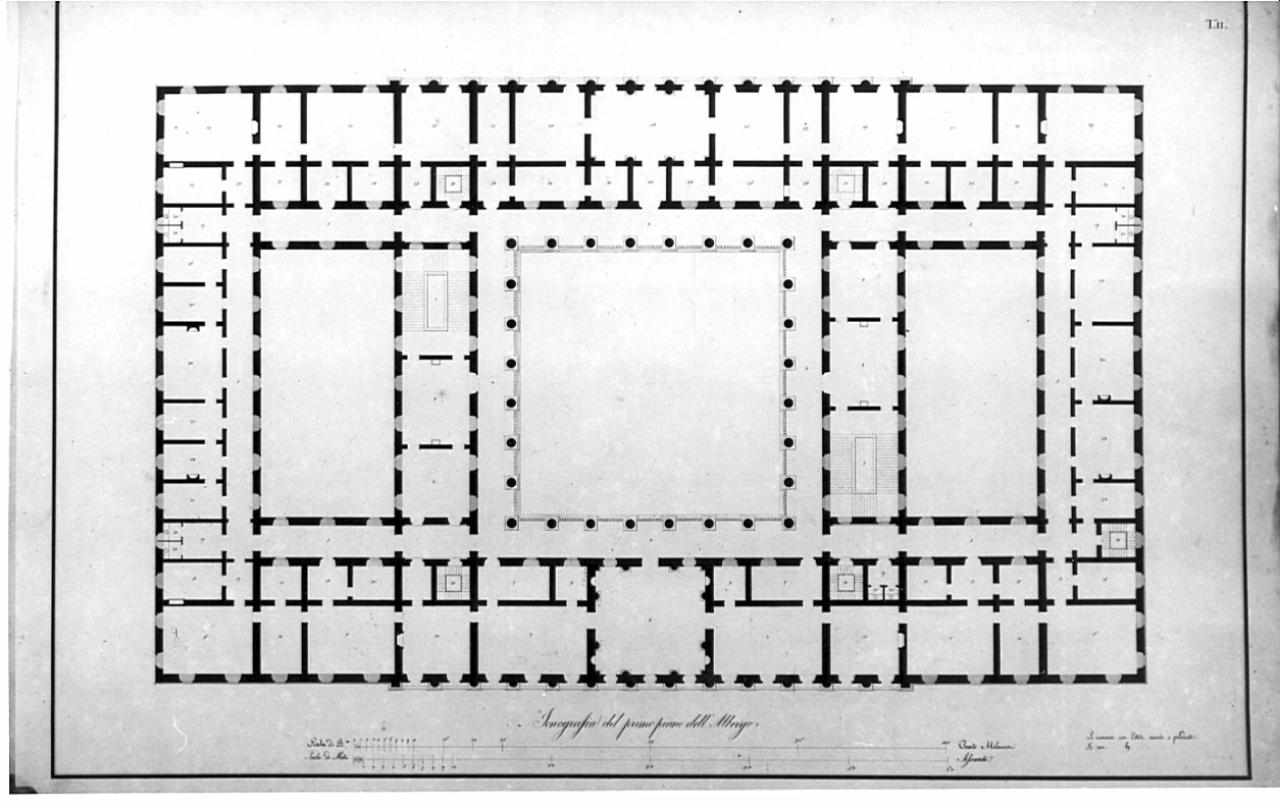 - NOTIZIE STORICO CRITICHE Appartiene alla serie di Tavv. dis. da Luigi Voghera allievo dell'Accademia e pensionato in Roma per il Concorso di Architettura in Prima Classe, bandito con programma del 1814. Le tavole sono raccolte nella cartella M I 92 contenente i progetti vincitori dei Concorsi indetti dall'Accademia dal 1814 al 1822. Luigi Voghera nasce a Cremona nel 1788. A 17 anni frequenta l'Accademia di Brera distinguendosi in numerosi concorsi.Tra le prime opere, frutto dell'esperienza maturata presso la sezione civile del Genio Militare, vanno ricordate il progetto per la Caserma S.Ambrogio e il restauro della facciata del Castello Sforzesco. Numerose le opere di Voghera realizzate nelle provincie di Mantova, Cremona, Brescia, Parma e Piacenza. Per citarne soltanto alcune, ricordiamo: Casa Favagrossa a Casal Maggiore(1816), Sede della Filanda Bertarelli a Cremona (1834), la Villa Manfredi a Cigognolo(1839) e il campanile della chiesa di San Siro a Soresina (1839).