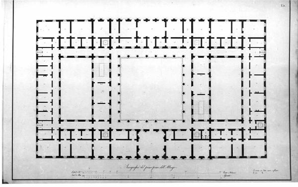 Progetto di un Grande Albergo per una città popolosa a china e bistro (primo piano dell'albergo). Pianta con vista della balaustra e sezione delle colonne del loggiato del cortile centrale, dei 4 servizi igienici doppi, dei vani scala e dei vari ambienti. Numeri di riferimento ad una legenda che non si è conservata con il disegno.