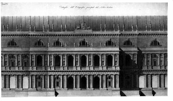 Dettaglio dell' ingresso principale. La scala di maggior dettaglio permette la definizione più precisa dei particolari decorativi e scultorei. Al piano terra colonne tuscaniche e al piano superiore ordine ionico. Alta cornice marcapiano separa il piano. Sulla sommità del \ncorpo d'ingresso sono poste statue. Al di sopra del piano attico con finestre termali è posta una balaustra con statue. Al centro gruppo scultoreo costituito da due statue reggenti uno scudo. La copertura a botte delle Sale è campita in acquarello azzurro.