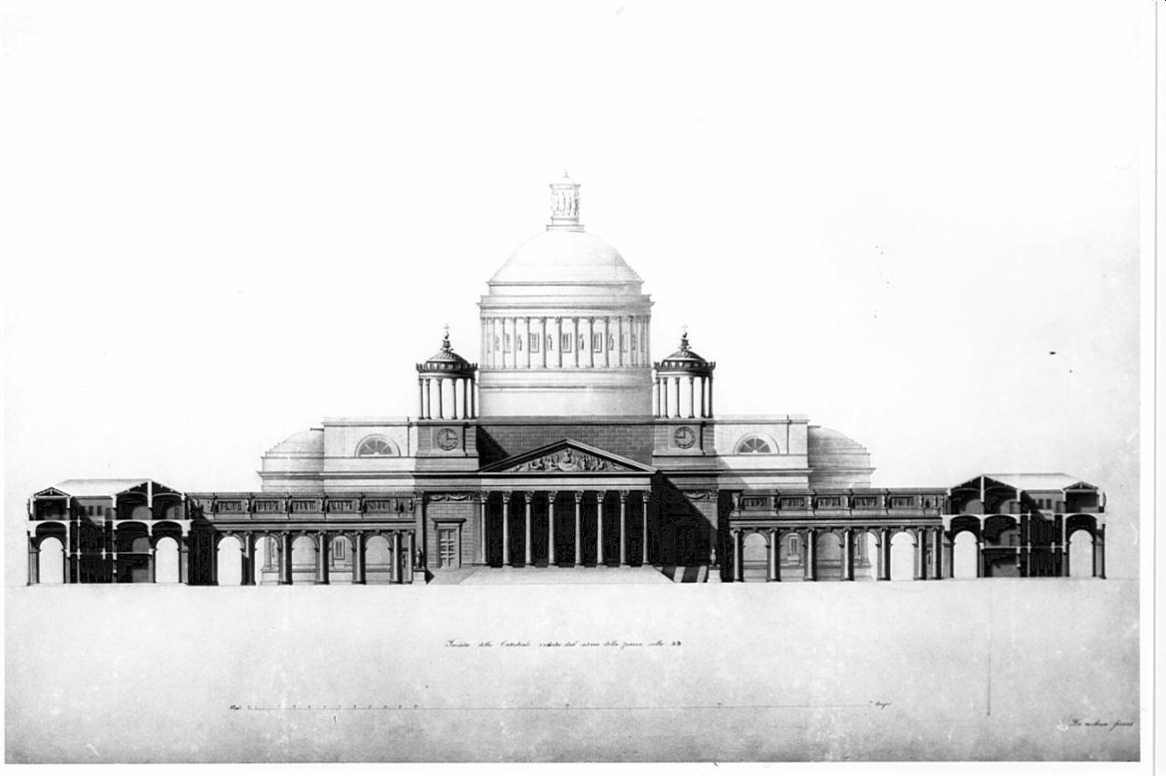 Prospetto della cattedrale e sezione trasversale degli edifici prospicienti la piazza a china, bistro e acquarello rosa per le parti sezionate. Vista della facciata della chiesa con pronao octastilo in ordine corinzio sormontato da alta trabeazione e da timpano decorato con bassorilievo. Ai lati del pronao due torrette con orologio concluse da colonne reggenti una cupoletta abbassata riccamente decorata. Vista del corpo centrale e della cupola posta su alto tamburo colonnato con finestre rettangolari e statue entro nicchie. Sulla sommità in corrispondenza del Lucernario un gruppo di cariatidi regge una cupola. La sezione degli edifici mostra i portici sulla piazza, i portici esterni e l'interno degli edifici a corte centrale.