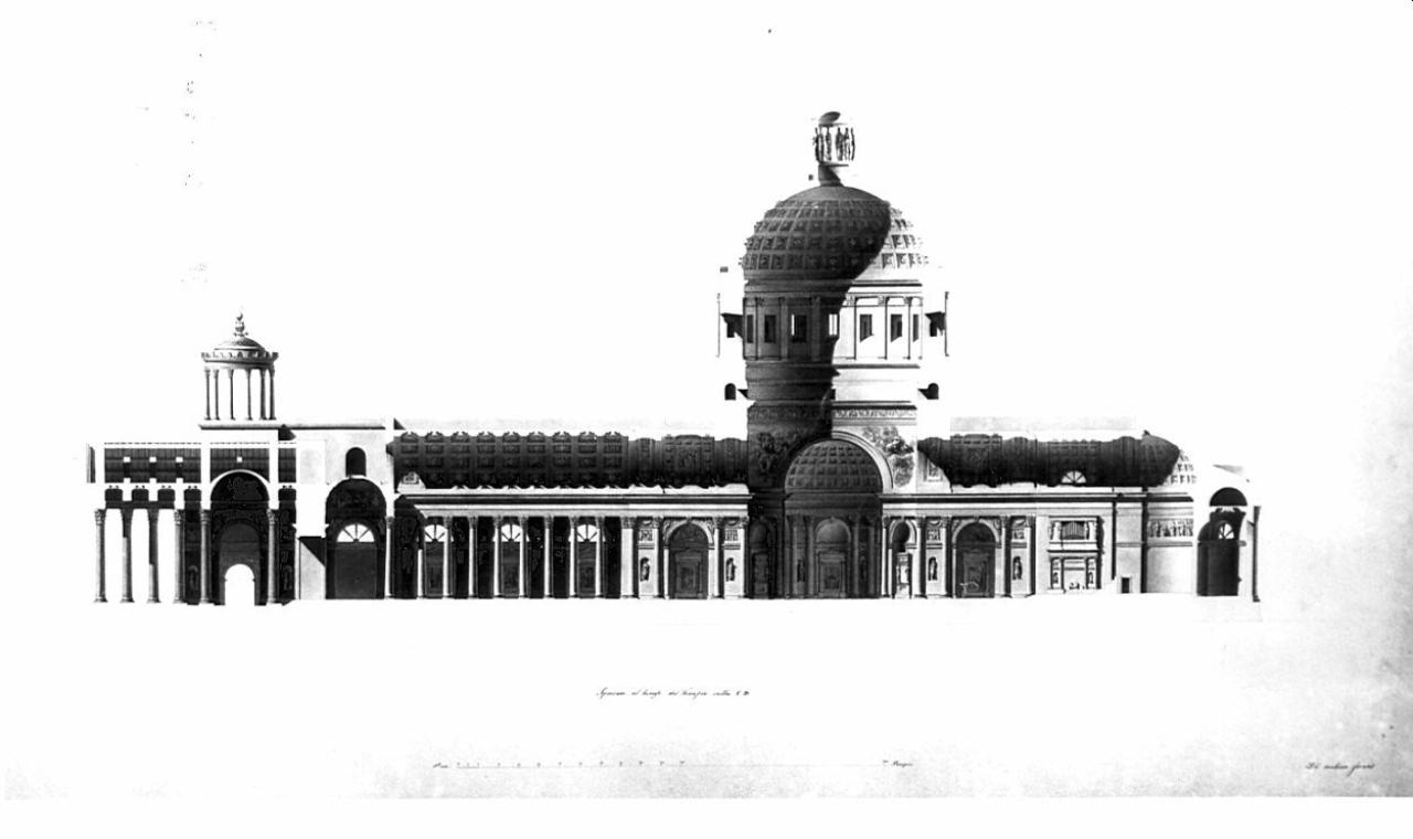 Sezione longitudinale della cattedrale a china, bistro e acquarello rosa per la parti sezionate. Vista dell'aula interna della chiesa delimitata da colonne corinzie, vista sullo sfondo delle cappelle. L'aula è illuminata da finestre a lunetta. La copertura a botte cassettonata poggia sulla trabeazione.Sezione della parte centrale coperta a cupola. Vista dell'alto tamburo, della cupola e del lucernario. La sezione mostra l'Altare Maggiore, il coro con l'organo e l'abside terminale del tempio.