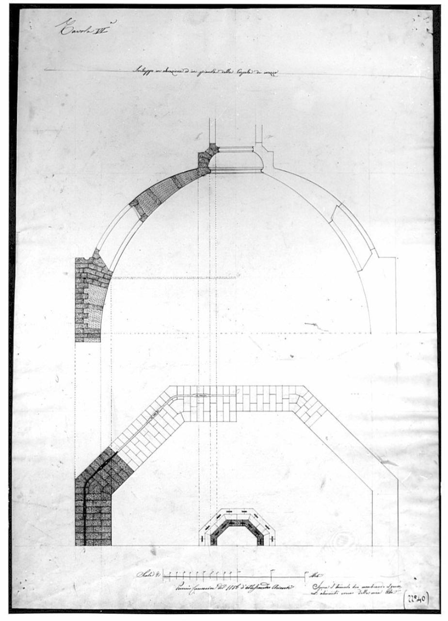 Sezioni (pianta e alzato) di una cupola con struttura in muratura e parti in ferro rappresentate in china blu. Inf. parte del perimetro poligonale della muratura su cui si imposta la cupola.