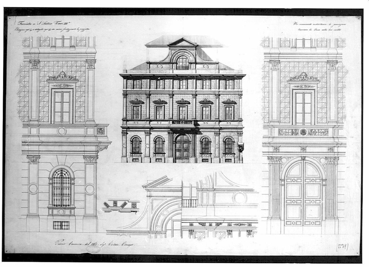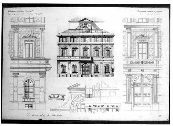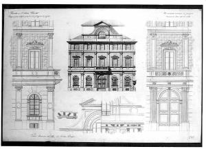 La tavola contiene al centro il prospetto ombreggiato di un edificio a 3 piani cm piano attico. Facciata simmetrica con portale centrale d'accesso ad arco. Al centro inf. particolari del piano attico e del cornicione. A sin. particolari dell'edificio: parte conclusiva della facciata con finestra ad arco al pt. i entro paraste e al primo piano finestra rettangolare. A ds particolare della parte centrale della facciata con portale ad arco al pt., e balcone cm balaustra e porta finestra rettangolare al piano superiore.