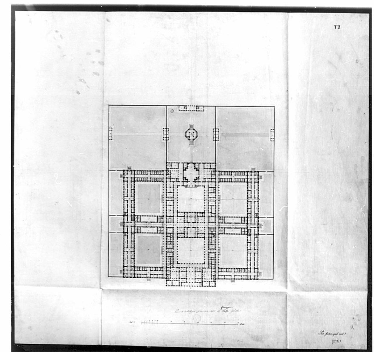 Pianta di edificio con murature sezionate campite a china, aree aperte (cortili e giardini) acquarellate in verde, percorsi di collegamento acquarellati in azzurro. Edificio a pianta quadrangolare simmetrica con 6 cortili e corpi in aggetto sul lato inf. (portico d'ingresso) e sul lato sup. (chiesa a pianta centrale). Edificio circondato da recinzione. Giardino posteriore con corpo a pianta ottagonale posto al centro.