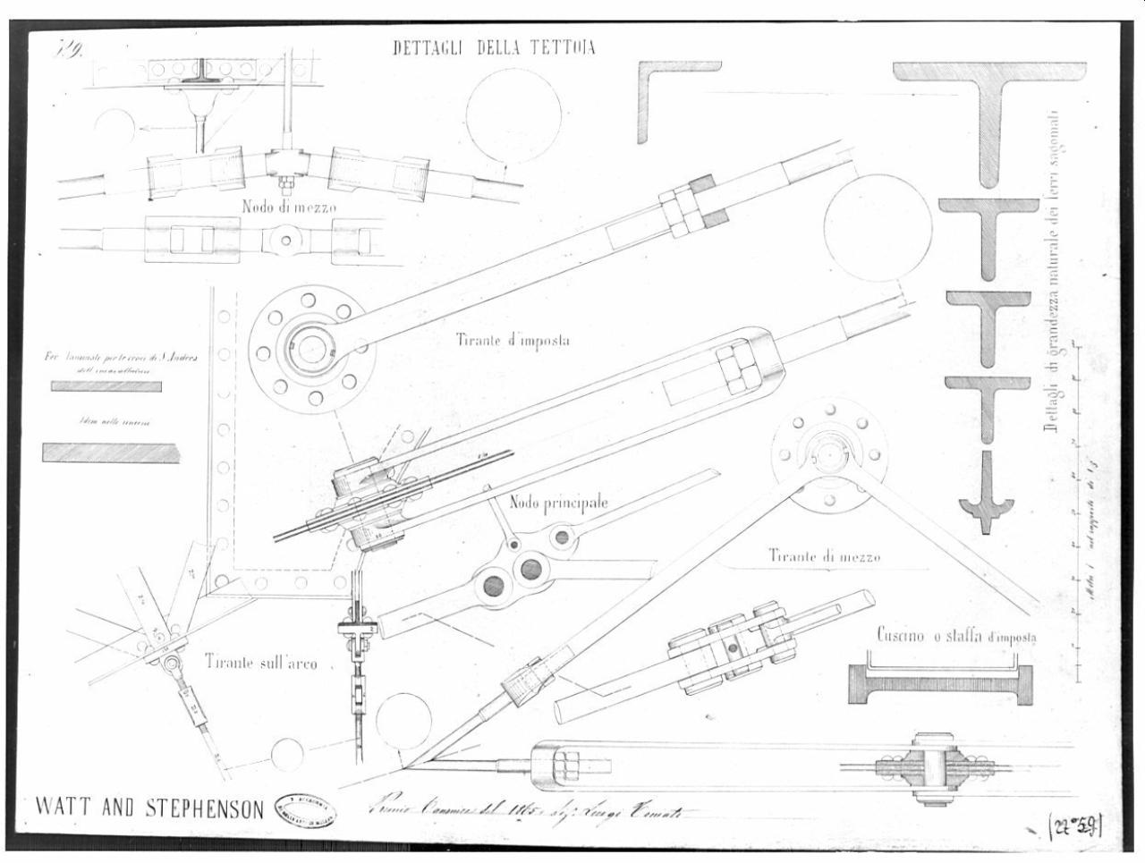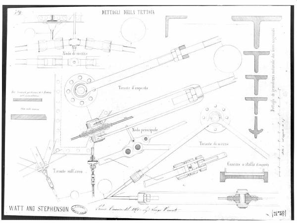 La tavola presenta una serie di particolari costruttivi delle strutture in ferro della tettoia: tiranti, nodi e dettagli dei profilati a " T "in ferro.